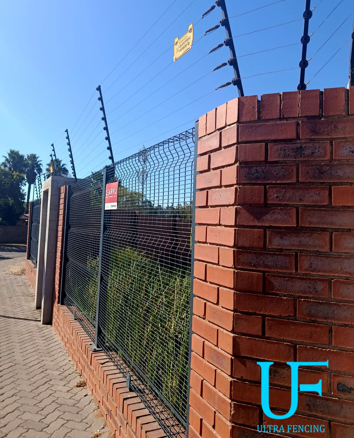 8 line fence running on-top of brick ppillars and cleurvu fence