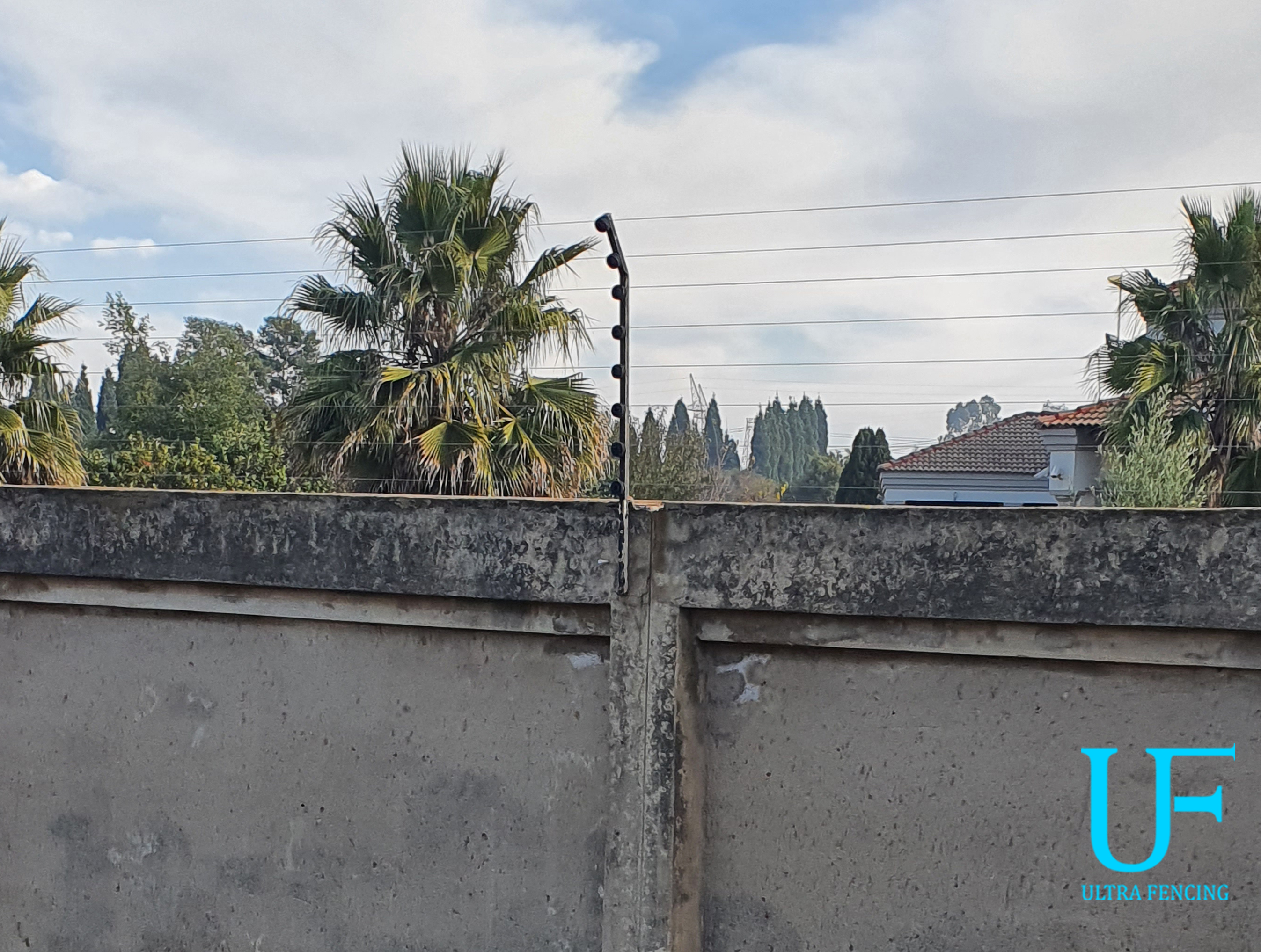 8 line fence on-top of brick wall with an angled post at the top.