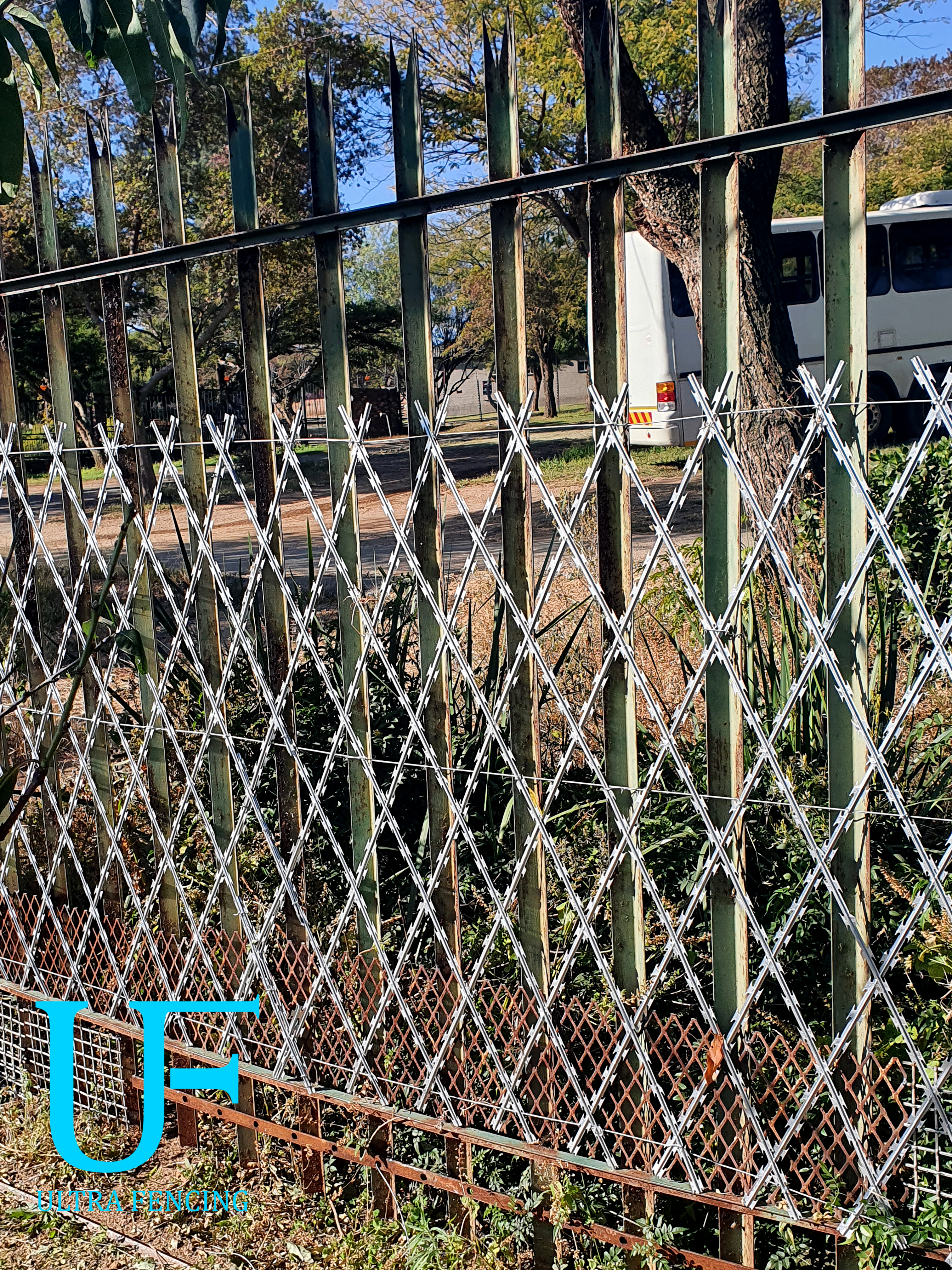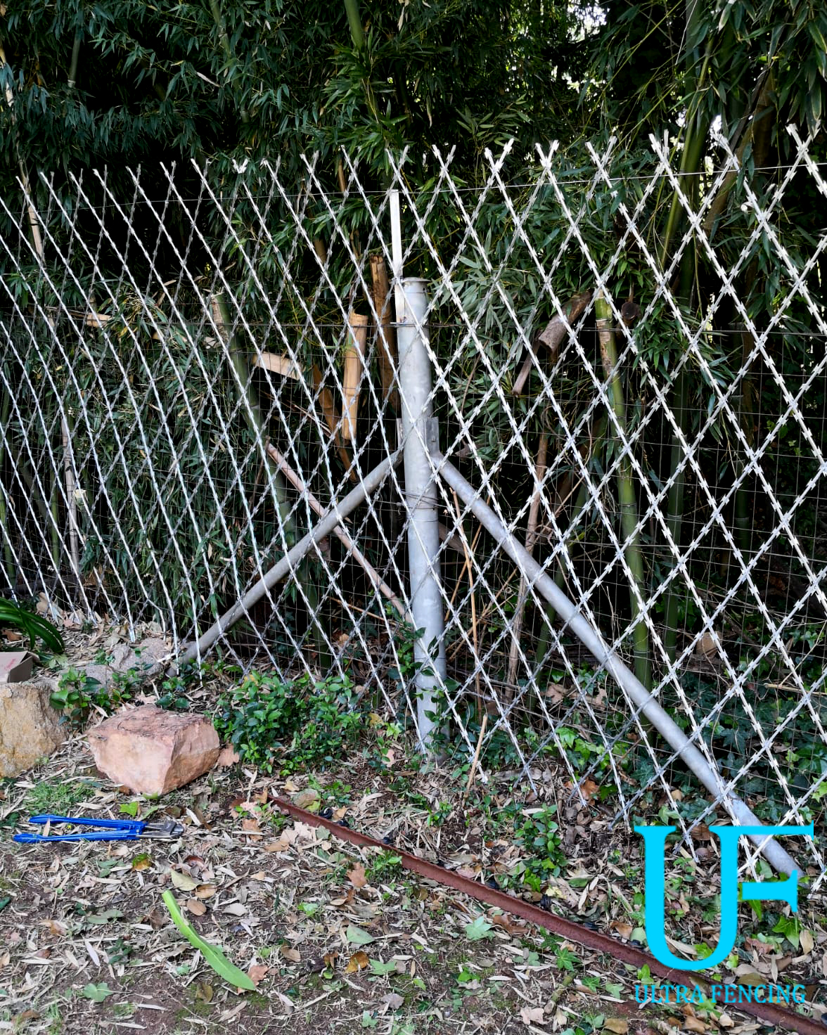 Diamond razor mesh 1.8m high fasten against palisade fence.